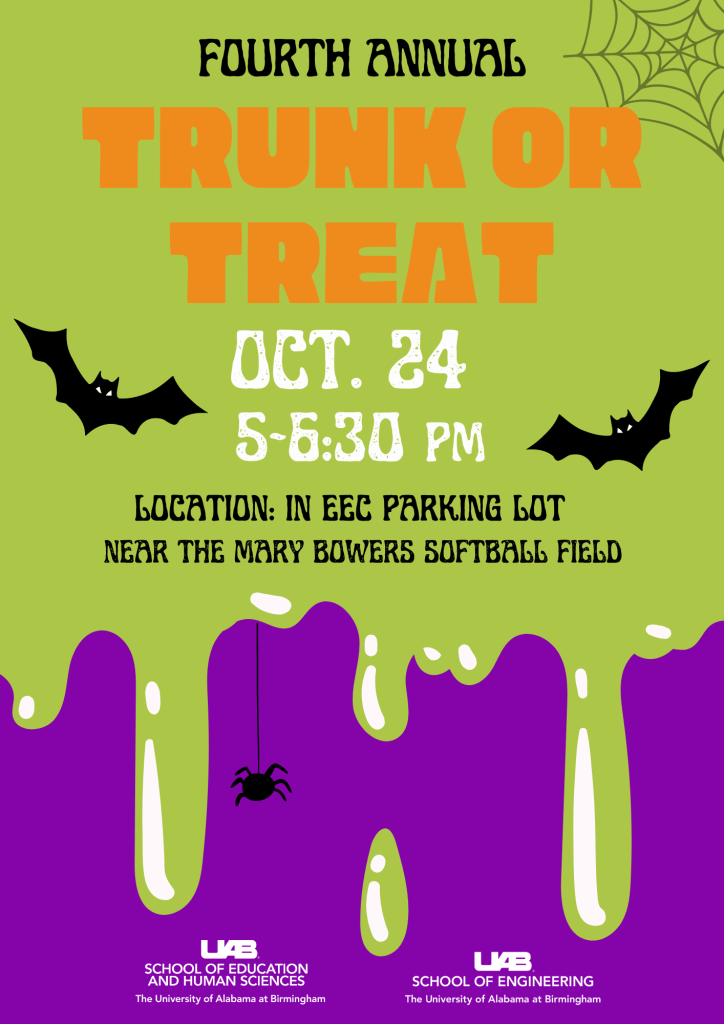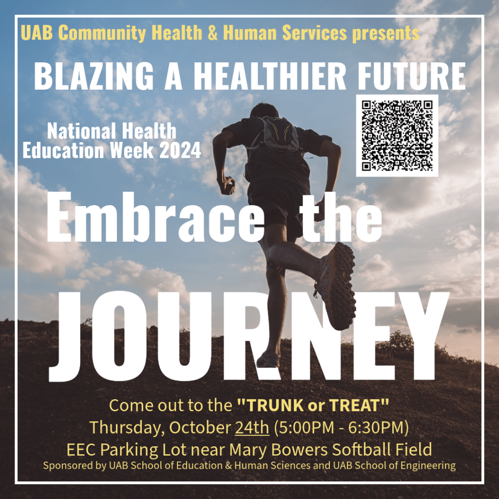 Please join the UAB Community Health & Human Services (CHHS) Program and have a good time ‘moving’ at the School of Education & Human Sciences “Trunk or Treat” event on Tuesday, October 24th (5:00pm – 6:30pm). The CHHS Program will provide the sounds that keep you ‘moving and grooving’ as you visit different trunks to get your treats. Come out and play corn hole, dance in streets, and get some candy. We will have a few items in support of overall student health and well-being. Check us out in the Education & Engineering Complex (EEC). See the flyer below.